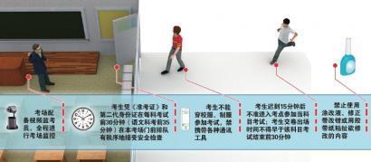 需要提醒考生的是,开考信号发出后方可开始答题。考生迟到15分钟后不准进入考点参加当科目考试;考生交卷出场时间不得早于该科目考试结束前30分钟。