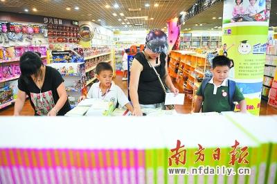 家长和小孩一起在书店选购教辅书籍。南方日报记者 王云 摄