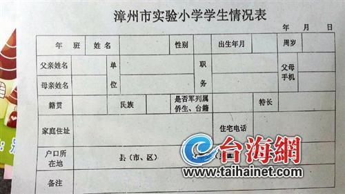今年,陈先生的孩子开始到漳州市实验小学读一年级。几天前,他带着孩子到学校注册,老师交代完各项事宜后,发给每位家长一张空白的学生情况表。