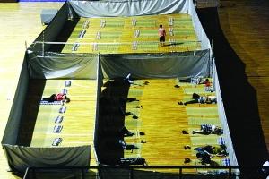 累了一天,家长在体育馆里打地铺