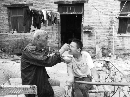 “你看,这孩子跟植物人一样,日常吃喝拉撒全靠我一人照顾。”昨日,记者来到马头镇大吴村,见到了80岁的吴之恩老人。他满头白发,正在院中给坐在推车内的脑瘫男孩喂水。老人一手搂着男孩,一手拿着勺子,每喂一口老人都会轻轻地吹一下,避免烫到孩子。“这一幕的温情,23年来不曾间断。”60岁的邻居吴焕仙说。