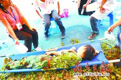 在中山一所大学的军训现场,烈日当空让不少新生直呼受不了,有同学甚至被晒晕,被担架抬出接受治疗。(记者 王云 摄影报道)