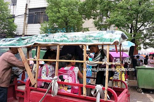 9月6日,记者在万年县第二小学附近看到,没有任何牌照的“黑三轮”堂而皇之地在此揽客,其中一辆三轮车上竟然挤了6个孩子,真让人捏了一把汗!(记者海波摄)