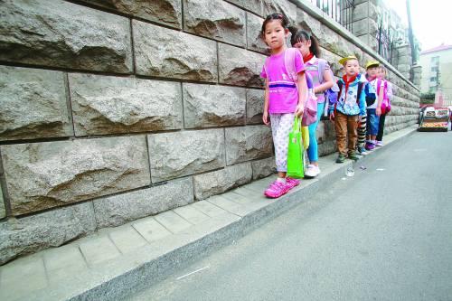 9月11日,济南运署街上,孩子们沿着仅30多厘米宽的人行道上学。“最窄人行道”附近有一所中学和一所小学,每天有近千名学生通过此道上学堂。 陈宁摄
