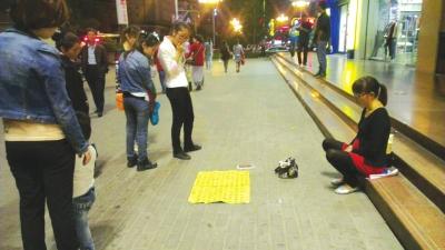 9月14日,在张掖路步行街上,一个孕妇模样的女子跪在新世界商场门口。该女子看上去二十八九岁,戴眼镜,垂着头,穿戴整齐,上身穿一件红色下摆的孕妇装,下身穿一条黑裤子,女子身前的黄色纸张上写着她的遭遇。该女子自称是一名教师,因为工资微薄,丈夫不得不去打工,结果不幸受伤,现在需要8000元治伤。此时正是晚上8点多钟,张掖路上熙熙攘攘,围观该女子的市民有十多个。有些市民看上一眼摇摇头,表示感觉该女子是个骗子。一些市民则慷慨解囊,一元、两元、五元、十元……不一会儿,女子身边的黑色口袋就装满了,但是该女子并没有离开的意思。面对好心市民的询问,女子的回答错漏百出,前言不搭后语。