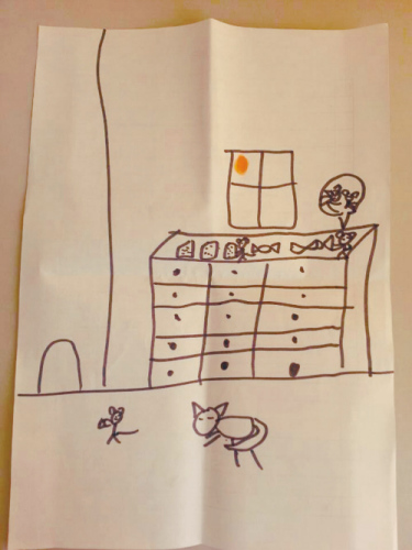 解析:一个9岁男孩画了老鼠一家,鼠爸鼠妈在桌子上搬运奶酪,小老鼠也和爸爸妈妈一样辛勤地劳作。可以看出孩子对父母有着深刻的认同,在思想和行为上都保持一致。表面上看这是幸福的一家人。可是,小老鼠后面却有一个大家伙,仔细一看,是只大猫。