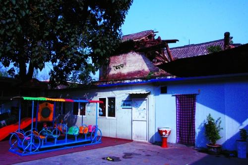 走进这家幼儿园,紧邻坍塌戏楼的是东西向一溜5间简易板房,东侧是一排南北向的教室,共9间。院落中空地约有300平方米,西南角摆放着供幼儿玩耍的器材,十来个幼儿在上面玩乐。