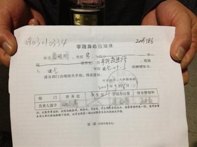 记者从校方提供的王浩的“学籍异动通知单”上看到,“学籍异动通知单”是2009年9月16日出据的,明确载明他是进修生,学校各部门共有4份存档。有财务处、学院办公室和宿舍管理科的负责人签字,学工处一栏画上了叉,没有填写。通知单下面的注写着此通知单由学生将第一栏送回教务处再办理相关手续,并印有哈尔滨理工大学的公章。
