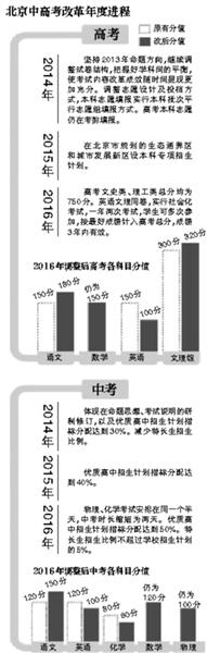 昨日,北京市教委发布中高考改革征求意见稿并向社会征求意见。此次改革中,高考五科目除了数学分值没变外,其他四个科目的分值均有调整。此次改革的亮点之一是将降低中高考英语分值、提高语文分值,其中,2016年起中考语文卷总分值由120分增至150分;高考英语由150分减为100分。