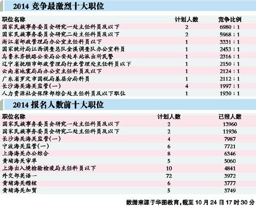 在考生报考的职位中,报名竞争最激烈的职位属于国家民委民族理论政策研究室研究一处主任科员及以下一职。截至昨日17时30分,该职位共有13960人报名,竞争比为6980:1。排名第二的是该研究室研究二处主任科员及以下一职,报名人数为11936人,竞争比也有5968:1。