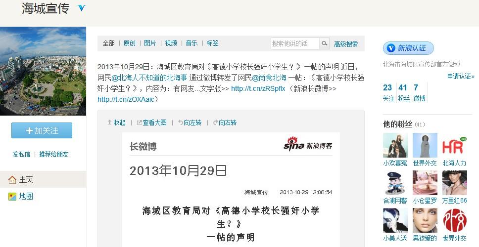 最近,网传“北海市海城区高德小学校长强奸小学生”。今日,北海市海城区宣传部官方微博发布消息称:“经初步调查,网上反映的情况与事实不符,不存在校长强奸小学生情况。”
