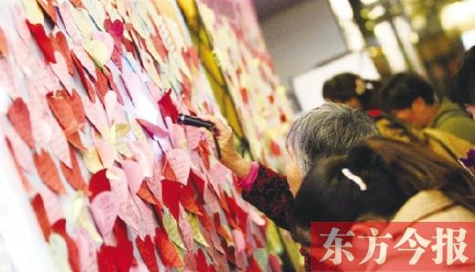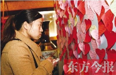 在会场,一位满头白发的老太太吸引了记者的注意,她拿着小手电,正在“有缘牵手”征婚墙上仔细地研读。老人看了一遍又一遍,最终拿出的本和笔又放到了口袋里。