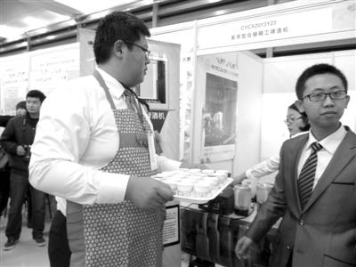 比赛刚刚开始,家用型自酿啤酒机展台就被参观者们团团围住。当记者走近展台时,一股啤酒特有的芳香飘了过来。一个穿着围裙的男生在展台前忙得不可开交,他一边免费发着自酿的啤酒,一边介绍着展台上的一个酒桶似的自酿啤酒机。