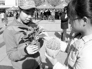昨天上午9时,20岁的大二学生王鑫就带领学校精英社20多名社员,来到大学校园生活广场,布置“垃圾换绿植,呼吸好空气”活动现场。他们在现场悬挂起垃圾换鲜花说明:矿泉水瓶15个,或8本书、8个啤酒瓶,兑换1个大个盆栽;矿泉水瓶10个,或6本书、6个啤酒瓶,兑换1个小盆栽;矿泉水瓶20个,或10本书,兑换1个小玩具……