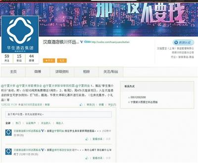 12月2日,新浪微博实名认证的“汉庭星空(上海)酒店管理有限公司银川怀远路分公司”发布一条促销微博推出“学生推介积分”活动,并且抄送@宁夏大学等。