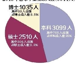 以2013届毕业生为例,全校本科、硕士和博士毕业生共有6644人。其中本科毕业生3099人,只有775人出国留学,占25%;硕士毕业生2510人,出国留学的只有206人;博士毕业生1035人,出国的仅有88人。
