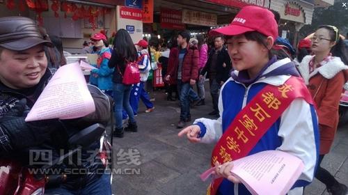 从学校所在地小天竺街出发,沿人民南路一路向北,同学们来到了天府广场,后又辗转盐市口、春熙路、西南书城等成都人流量集中的地方,向市民派发《捍卫蓝天白云,拒绝烟花爆竹》的传单。一开始,同学们都比较害羞,不好意思向陌生人递出传单,更别说同时还要进行相关环保理念的宣讲了。而当接过同学们传单的市民多了,大家也渐渐开始有了信心。