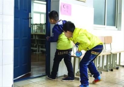 图说:等候面试的小朋友在教室外“打探虚实”。目前不少城市择校热都集中在民办小学。新华社