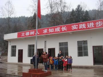 昨日上午9点半,石庙村小学唯一的老师廖占富带领全校16名学生,在当地村支部书记、学校校长及众多学生家长的见证下在新学校举行了意义特殊的升旗仪式。