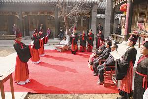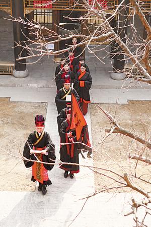 由燕赵晚报主办、太行茶仓协办、右衽汉礼承办的“清平乐·二月二冠礼”仪式,昨日在位于龙泉寺门口右侧的太行茶仓举行。活动由河北省传统文化协会会长袁学骏担任仪式正宾,为崔栋、吴克、李硕3位男生的加冠。来自陕西省西安市非物质文化遗产中心“特聘学者”胡忠宝先生作为执事在仪式中协助正宾加冠,并指导了整场的礼仪活动。