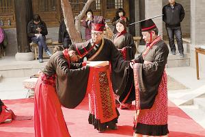冠礼者从正宾手中接过冠礼证书,宣告长大成人。