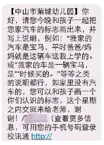 近日,有网友爆料称小榄菊城幼儿园老师以宝马为例,布置了一条让家长和孩子一起画自家汽车标志的作业,并注明“平时爸爸/妈妈就是这辆车送我上学的”或“我家的车是一辆宝马,是某某时候买的”等字样。该事件迅速在网上引发热议,不少网友认为幼儿园布置的该项作业带有一定的目的性,想“调查学生家底”、“让学生自小学会攀比”等声音不绝于耳。对此,记者向菊城幼儿园求证,园方负责人回应称该事件系误会,是老师短信用语不当所致,目前园方已经取消了该项作业,并向家长致歉。