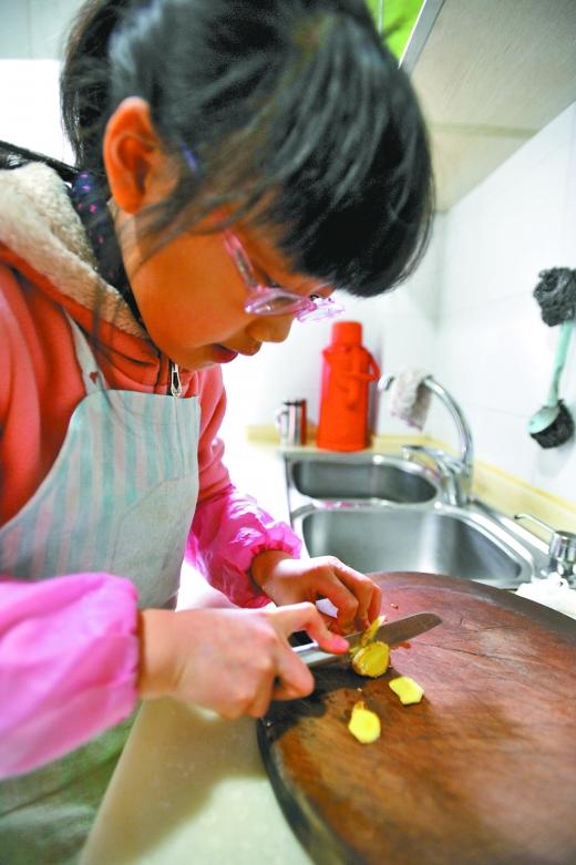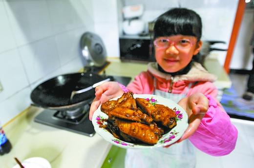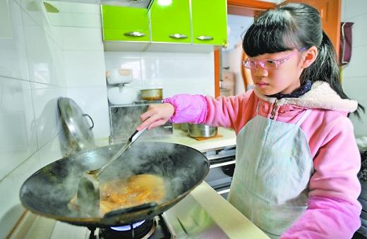 王筝刚学会炒菜时,因身高不够,还需要在灶台前搭个小凳子才能灵活地挥动锅铲,现在她炒菜时,左手端锅、右手拿铲的样子已十分娴熟。现在,对于自己拿手的几个菜,她已能独自完成操作,不用边炒边请教大人了。朱女士说,虽然女儿能炒几个菜,但她有时也会对女儿泼点冷水,“能炒的菜都是比较简单的,做起来不复杂,要想把菜做好,要学的东西还有很多。”她觉得,既然孩子对做菜有兴趣,那就不该磨灭她的兴趣,只要好好教,慢慢引导,孩子的独立生活能力会越来越强,做事也会越来越细致。