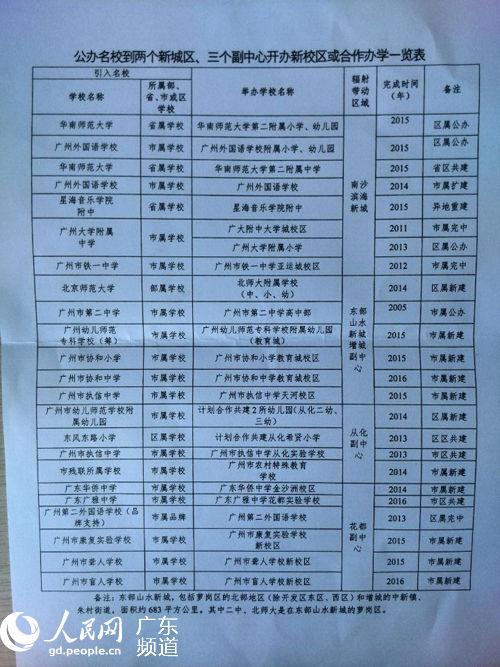 图为记者从广州市教育局拿到的“公办名校到两个新城区、三个副中心开办新校区或合作办学一览表”。 冯芸清 摄