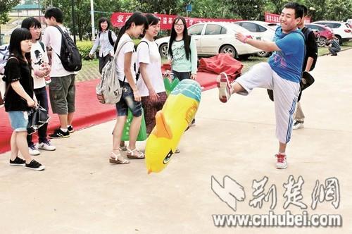 图为:昨日,江汉大学学生在校园内踢打宣泄娃娃
