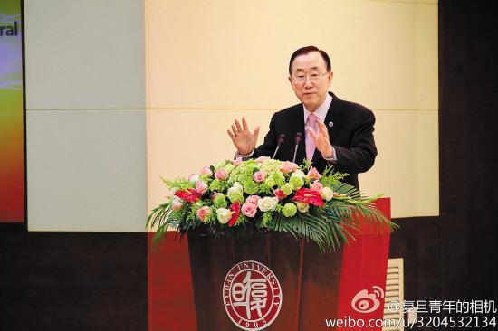 5月22日,联合国秘书长潘基文来到复旦大学,在袁天凡报告厅与复旦学生见面,并发表了题为“联合国和全球公民的梦想世界”的演讲。在演讲与互动中,潘基文表达了希望中国的青年学生们在未来可以担起国际社会重任的期许。