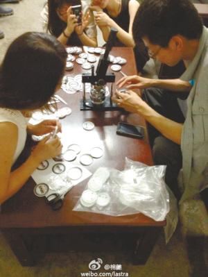 8日晚9时30分,毛竹菊召集了7个女生,李斯洋叫来3名男生,他们在活动室集合,开始徽章最后的制作。女生负责将打印好的徽章图案剪下来,男生负责将别针别在材料上,李斯洋则包揽了压徽章的任务。徽章机分A槽和B槽,所以制作时必须仔细,“将铁片、印有徽章图案的纸、塑料膜依次放在A槽内,用机器压,再将别有别针的一面放在B槽内进行按压,一个徽章就做好了。”李斯洋说,完整做好一枚直径58毫米的徽章,大约耗时1分钟。晚上10时40分,70枚徽章全部制作完成,11名同学分别将徽章带走,分发给班上的同学。