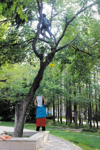 这是昨日早晨,记者拍摄于中山公园的一个镜头。一个五六岁的小男孩爬上5米多高的树,母亲不但不制止,反而配合孩子让这种危险行为继续下去,就连晨练者也为小男孩的安全捏了把汗。