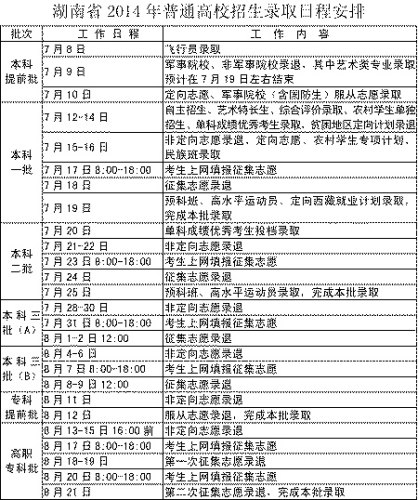昨日,省教育考试院公布了《湖南省2014年普通高校招生录取工作方案》(以下简称《方案》)。根据《方案》,我省今年的招生录取分六批进行,全部实行远程网上录取。录取时间为7月8日至8月21日。在湘高校(含本科院校和高职专科学校)在生源不足时,可在同批次录取控制分数线下20分内降分投档。