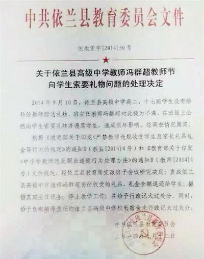 据依兰县教委前日所发《关于依兰县高级中学教师冯群超教师节向学生索要礼物问题的处理决定》称,9月10日,依兰县高级中学高二十七班学生没有给科任教师赠送礼物,班主任教师冯群超对此极为不满,在班级公然向学生索要礼物并谩骂学生,造成很坏影响,经调查情况属实。
