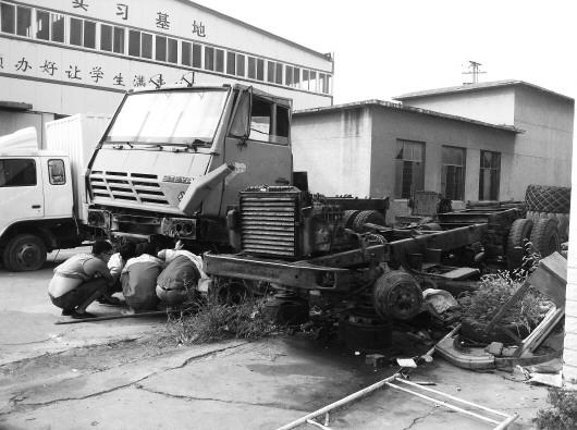 ◥21日下午,蓝翔技校东校区内,几名汽修专业的学生在校内实习。 本报见习记者 王建伟 摄