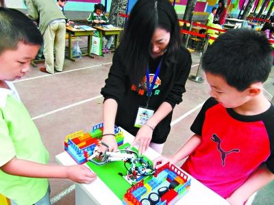 “小汽车·大梦想”是本届科技欢乐节的主题,放眼望去,操场上到处奔跑着小小的遥控赛车,这是孩子们在展示“越野车模型表演”。在车模拼插的展台上,有的小朋友聚精会神地安装着“小汽车”的轮胎、底座,有的小朋友则自己调制颜料,把车模涂绘成“炫酷个性款”。一位来自北京化工大学的志愿者告诉记者,“在拼插时,他们会为孩子讲解汽车的构造,加深他们对汽车的了解。”
