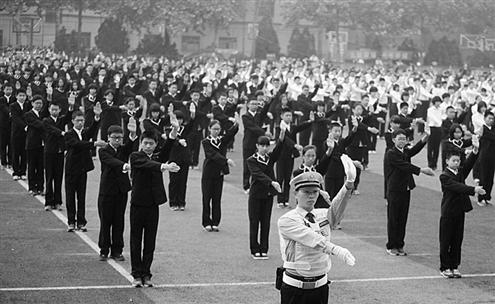 近日,在济南外国语学校的操场上,初三年级千余名同学在交警的带领下共同表演“交警手势操”。通过学习手势操中的八个动作,让同学们在寓教于乐中了解基本的交通安全常识,提高同学们文明交通的自觉性。记者 赵天羿 摄影报道