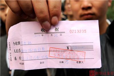 ↑10月10日,被骗学生展示盖有河南农业大学经济与管理学院专本连读专用章的收款收据。“新华社发布”客户端 记者 李安 摄