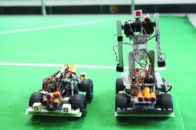 一个高个,一个矮个,两机器人在白色的道路上疾驶,道路纵横交错,在岔路口,它能快速准确选择道路;穿越险境达到景点后,它能马上敏捷地掉头……在近日举办的2014中国机器人大赛暨RoboCup公开赛的比赛现场,南京理工大学自动化学院的学生们制作的这两款“身高”不同的机器人吸引了全场的目光。