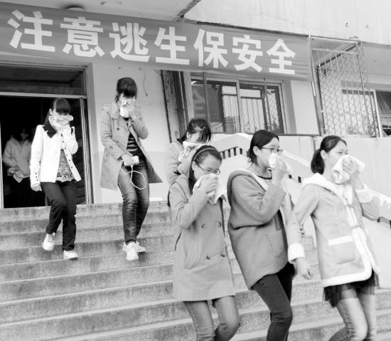 ●15时37分 距离宿舍门最近的几名女生,用毛巾捂住口鼻,猫着腰,迅速跑出大楼。