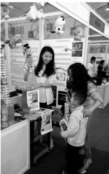 获得“挑战杯”特等奖后,杨韵芳的“ET手臂”和其他同学的作品一起在清华大学游泳馆南广场展出。这是一个类似嘉年华的活动,校内外人士都可以看到学生们的创意设想。杨韵芳的“象鼻子”承担起了发奖品的重要任务。一些小朋友在参加互动体验区的活动后,来到“象鼻子”前,这只机械手非常灵巧地从高处抓取一个毛绒玩具,送到小朋友的手里。不少人开心地大笑,要跟“大象鼻子”合影。