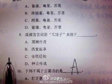 成都方言词语“瓜娃子”来源于哪里?A、英雄传奇;B、历史故事;C、士民迁徙;D、神话传说。当这道题出现在期末考试卷上时,可难住了不少同学。川师大汉语言文学专业大三学生矫健东是哈尔滨人,他直言,这样的考题对他这位外省人来说,简直太难了。“我们的《巴蜀移民文化研究》课,这学期主要讲了四川的方言文化。但是在我的记忆中,老师还没有讲到过‘瓜娃子’一词的由来。”矫健东说,交了试卷后,很多同学表示,这道题靠蒙的。