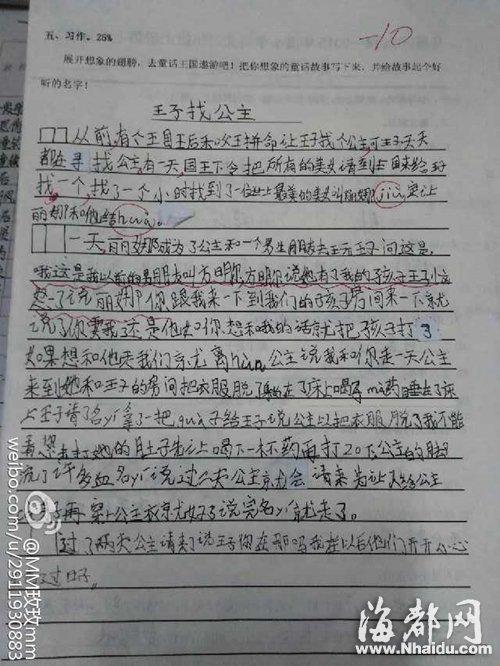 “班上学生写的作文,还只是三年级,看完整个人都不好了,必须跟大家分享。”昨日上午,网友“MM玫玫mm”在微博上发出一张图片,图片中是该网友所教的一名三年级小朋友写的作文,作文题目是“王子找公主”。