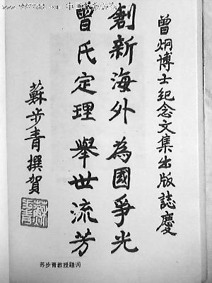 曾炯是中国最早从事抽象代数研究的学者,在抽象代数领域做出了重要贡献。1936年,他在《中国数学会学报》上发表了一篇论文,提出一个定理,但由于战乱关系长期不为国外同行所知。直到1952年,美国数学家S·兰才看到这个定理,并将它改进后重新推出,在全球数学界引起轰动。人们一直误认为S·兰是这个定理的首创者,直到上世纪70年代,该错误才得以纠正,数学界遂把该定理称为“曾-兰”定理(Tseng—Lan Theorem)。记者 魏莹 文/图