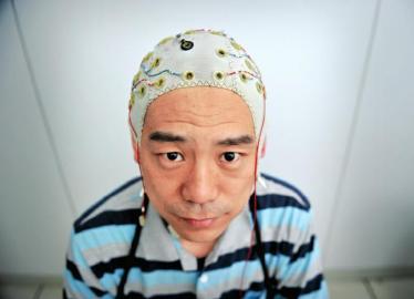22日中午,记者来到位于该校沙河校区的“神经信息教育部重点实验室”,其中的一间实验室内,一名研究生头戴一个“头套”,上面密密麻麻地接满了各种颜色的电线,连接着的电脑屏幕上,移动的线条代表着她脑波的运动。隔壁的房间,电脑旁边放着4个像小盒子一样的白色仪器,是“脑波放大仪”。“别看这个盒子这么小,一个就要25万,看,就这么点的4个就价值100万。”宫殿坤介绍说。