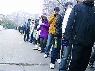 前日上午10时30分,湖北工业大学校门外火车票预售点,百米长队排过校门外过河桥还转了个弯。07级土木专业章雪峰早上6时多开始排队,他前面还有40多人,预计至少还得排上1小时。这是他进入新年后,第3次排队买票,第一次是元旦当天,从8时多排到11时,没买到票;第二次是1月2日,帮朋友买票,很幸运,只花了不到4小时便买到了。他表示,从武汉到十堰,坐汽车要150元左右,而坐火车,学生票半价只要40元,为省钱,只能拼时间等火车票。记者在现场调查十余位同学,均称每次排队时间在5小时左右。