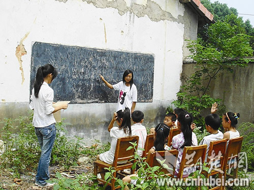 荆楚网消息 (楚天都市报) (特约记者良言)荆门市掇刀区麻城镇丁店村两名女高中毕业生自办暑期义务补习班,为偏远乡村的18名小学生补习英语和美术,前日该班“结业”。