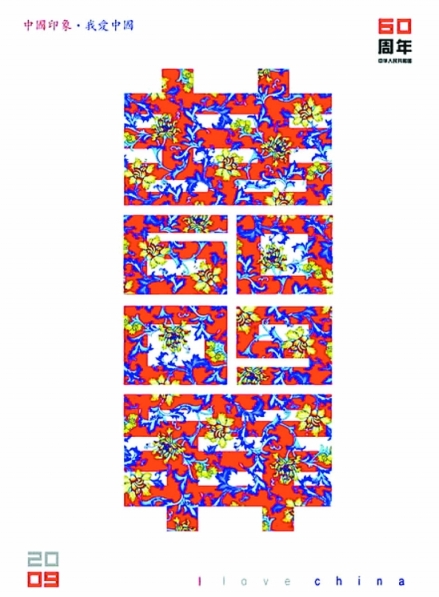 为迎接新中国60周年华诞,该校包装系教授陈瞻最近特意设计了这一款海报,其最大的特点远看是“囍”,近看又能凸显出09和60两个具体的主题,花纹和色彩设计烘托出喜庆气氛。
