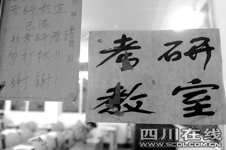 四川大学望江校区的大四学生王芳(化名)这两天有点郁闷,考研越来越临近了,要复习的课程和内容多而繁重,可是她还在经常为上自习的地方烦恼——原来,她经常上自习的望江校区东三教不少教室贴满了“考研教室已占满”、“考研教室,谢绝生人”等字样。她深感被拒之门外,苦于找不到一个复习备战考研的地方。