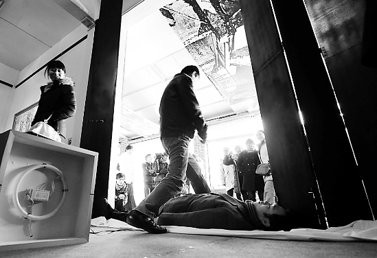 昨天,一名年轻的大学老师终于得偿心愿,做“门槛”:他穿着考究的西装,横躺在了东街6号艺术空间展厅的门前,身下是一溜胡乱铺就的白布,来自各行各业的众多男男女女、老老少少,各怀着忐忑、好奇、尝鲜的心态,从他脚上、身上、脖子上跨过,进门看画展。